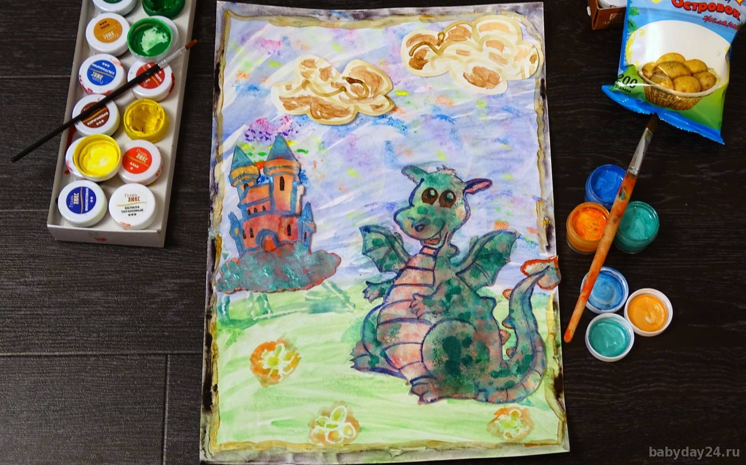 - Радуга сделана с помощью косметического спонжа. На прессованном спонже мы нарисовали при помощи гуаши и ватных палочек линии. Затем аккуратно окунули спонж в тарелку с водой. Он увеличился и стал круглым. Полученный рисунок сын нанес на картину, по принципу штампа. Зеленую чешую мы тоже рисовали с помощью спонжа, только уже на влажный спонж наносили краску.