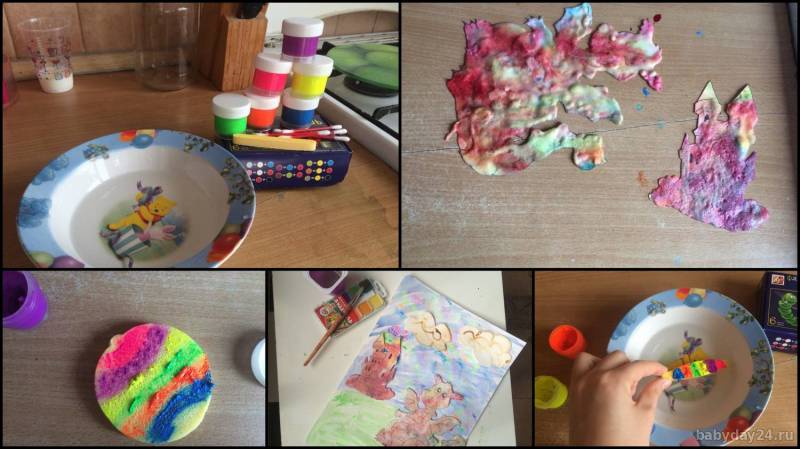 - Рисование с помощью цветной пены, но не той о которой вы подумали. Замок и динозавр были раскрашены при помощью химического опыта. Сейчас я говорю о первом слое, его можно увидеть в коллаже ниже. Мы использовали: